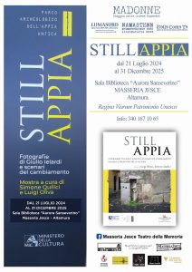 Nella Masseria Jesce prosegue sino alla fine del 2025 la mostra fotografica "Still Appia", con immagini di Giulio Ielardi, dedicate alla via Appia "Regina Viarum" che di recente è stata iscritta nella lista del patrimonio mondiale dell'Unesco. E' il 60esimo sito italiano che è incluso nella lista del patrimonio dell'umanità. Ielardi ha percorso a piedi il tracciato della via Appia, nel 2021, in solitaria, da Roma a Brindisi. Ha documentato quel viaggio con le sue foto che sono confluite in…