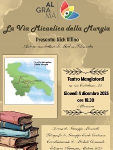 Giovedì 4 dicembre 2025, ore 18.30 – Teatro Mangiatordi, Altamura Presentazione del libro “La Via Micaelica della Murgia”, a cura di Giuseppe Marrulli. Fotografie di Carlo Centonze – Coordinamento di Michele Gismundo – Editore Algramà. Conduce Nick Difino (Telenorba).