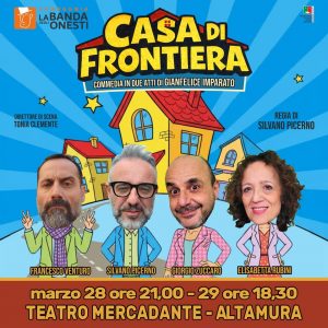 Sabato 28 marzo ore 21 e Domenica 29 ore 18,30al Teatro Mercadante di Altamura torna La banda degli onesti in "CASA DI FRONTIERA" di Gianfelice Imparato in prima assoluta, con Silvano Picerno, Giorgio Zuccaro, Francesco Venturo, Elisabetta Rubini, per la regia di Silvano Picerno, direttore di scena Tonia Clemente. In un futuro indefinito, l’Italia è stata divisa in due. Dopo la secessione tutti i Meridionali residenti al Nord, che non sono riusciti a rimpatriare, sono stati confinati in centri molto…