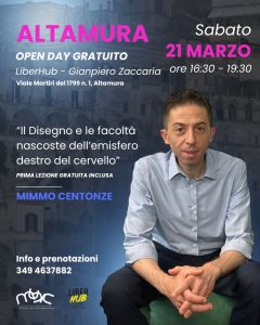 ALTAMURA - Sabato 21 marzo 2026 dalle 16:30 alle 19:30 Mimmo Centonze terrà un Open Day gratuito sul Disegno presso LiberHub - Gianpiero Zaccaria, in viale Martiri del 1799 n. 1 ad Altamura. L'argomento sviluppato da Centonze sarà: "Il Disegno e le facoltà nascoste dell'emisfero destro del cervello", e includerà anche la prima lezione gratuita. Per informazioni e prenotazioni contattare il numero 349 4637882. Mantenere attivo l'emisfero destro del cervello attraverso il disegno sviluppa rilassamento, intuizione, immaginazione, globalità del pensiero,…
