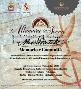 Sarà presentato, mercoledì 17 settembre, alle 20.00, in piazza Repubblica, il progetto “Altamura in Scena: Mercadante, Memoria e Comunità”, promosso dall’Accademia Obiettivo Successo con la direzione artistica dell’attrice e regista, Cinzia Clemente. L’iniziativa, sostenuta dal Consiglio Regionale della Puglia e patrocinata dal Comune di Altamura, nell’ambito delle iniziative culturali volte alla valorizzazione del patrimonio artistico e identitario del territorio, è in programma ad Altamura da ottobre a dicembre 2025. Il progetto celebra la figura e l’eredità di Saverio Mercadante, illustre musicista e compositore altamurano, attraverso un percorso che intreccia teatro, musica, arti visive e incontri pubblici.…