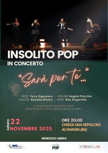 DUE CONCERTI PER LA GIORNATA INTERNAZIONALE PER L’ELIMINAZIONE DELLA VIOLENZA CONTRO LE DONNE "SARÀ PER TE...”: Altamura e Gravina in Puglia – Due concerti ideati e donati dal gruppo interamente al femminile INSOLITO POP, composto da Terry Digennaro alla voce, Rossella Bifulco al flauto traverso, Angela Pisicchio al violino e Rita Zingariello all’arpa. Il gruppo propone un repertorio che abbraccia brani del cantautorato italiano ed internazionale, con arrangiamenti e Direzione Artistica del Maestro Angelo Nigro. L'iniziativa celebra la "Vittoria dell'Anima" femminile, in occasione della Giornata internazionale per l'eliminazione della violenza contro…