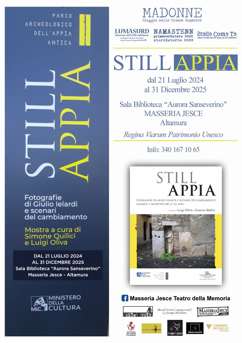 Nella Masseria Jesce prosegue sino alla fine del 2025 la mostra fotografica “Still Appia”, con immagini di Giulio Ielardi, dedicate alla via Appia “Regina Viarum” che di recente è stata iscritta nella lista del patrimonio mondiale dell’Unesco. E’ il 60esimo sito italiano che è incluso nella lista del patrimonio dell’umanità.